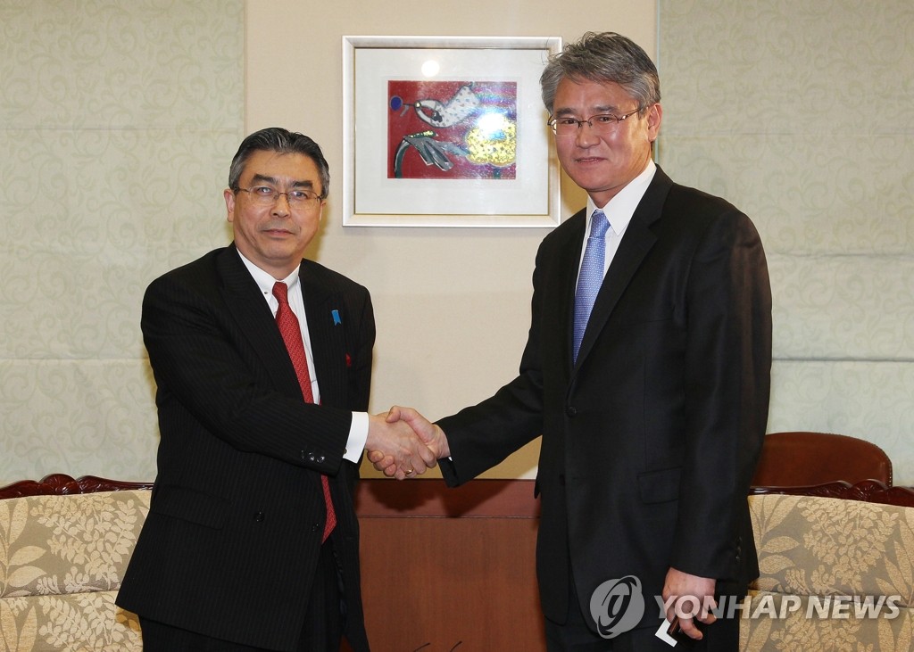 六方會談日本代表團團長、日本外務省亞大局局長杉山晉輔(左)7日訪韓,並於下午會見了南韓外交通商部第一次官樸錫煥。此次訪韓期間,他將同韓方磋商朝鮮鈾濃縮項目(UEP)在聯合國安理會上的處理問題,以及以朝鮮真正改變態度為前提,重啟六方會談的方案。韓聯社 2011-3-7