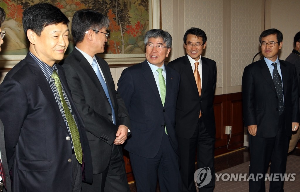 南韓銀行總裁金仲秀(左二)22日在南韓銀行大樓主持召開經濟動向懇談會,在同與會者交談。金仲秀在席間表示,有效解決住房問題才能實現內需增長。韓聯社 2010-12-22