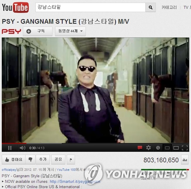 24日,歌手PSY的《江南Style》的音樂視頻在全球著名的視頻分享網站YouTube上的點擊量突破8.0369億次,登上YouTube點擊量排行榜第一位。韓聯社 2012-11-24