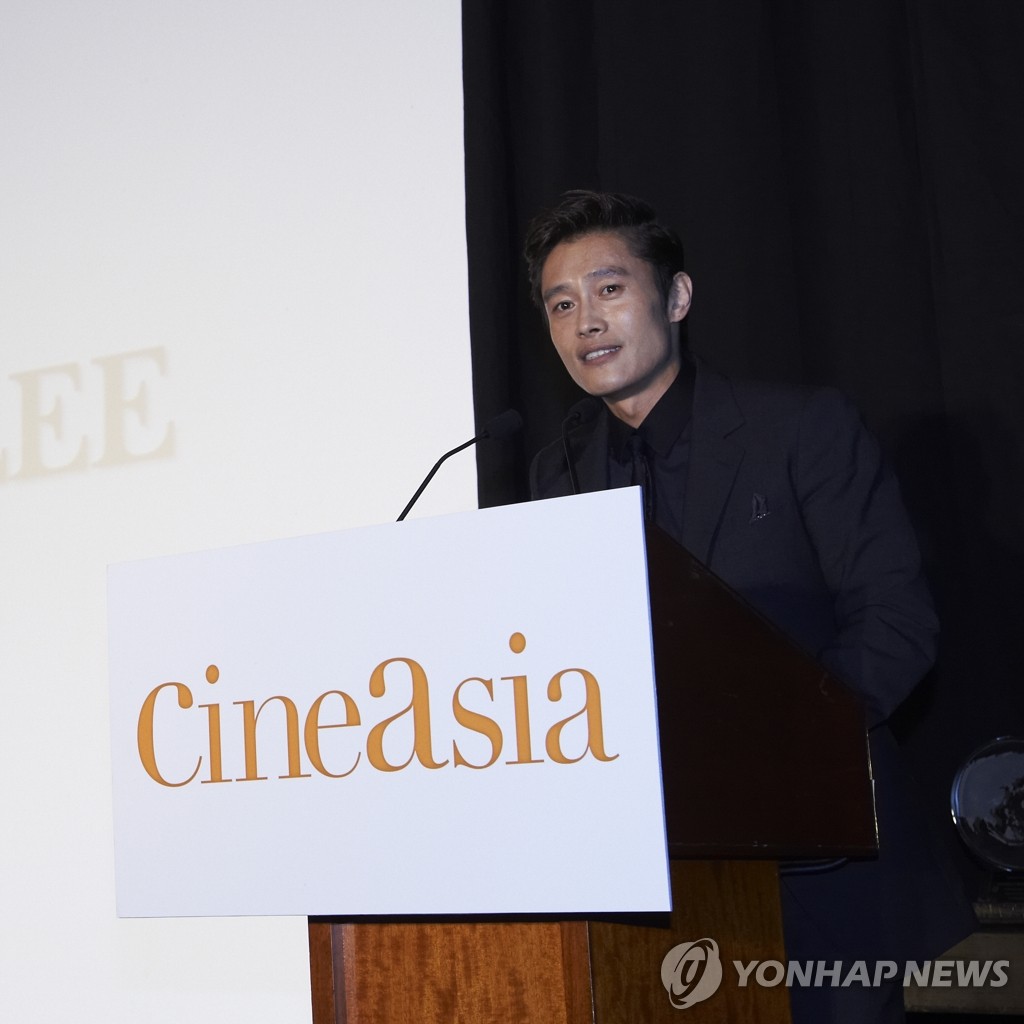 13日上午,演員李炳憲(中)出席由CineAsia在香港國際會展中心舉行的“CineAsia 2012 Award”頒獎典禮,獲得了年度之星獎。CineAsia是每年12月在香港舉行的亞洲最大規模的電影博覽會,每年會向一名在今年最受關注的亞洲明星授予“年度之星”獎。圖為李炳憲在用英語發表獲獎感言。韓聯社/CJ娛樂公司提供 2012-12-14