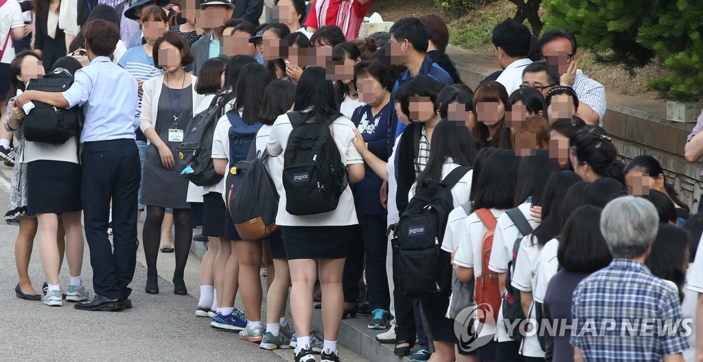 25日,“世越號”沉船事故中生還的京畿道安山市檀園高中2年級部分學生在事發後時隔71天重返校園。部分遇難學生的家長當天到學校迎接生還學生,學生和家長互相安慰和鼓勵。韓聯社 2014-6-25