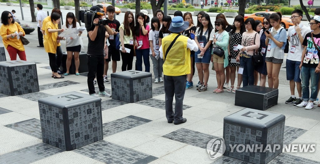 首爾市政府專門為外國遊客和居住在國內的外國人推出並運營“首爾故事旅遊”項目。參加項目的外國人可在東大門、世宗大街、汝矣島公園等景點聽取導遊的講解,體驗和了解南韓文化。圖為27日參加活動的外國人在世宗路公園聽取導遊的講解。韓聯社 2014-6-27