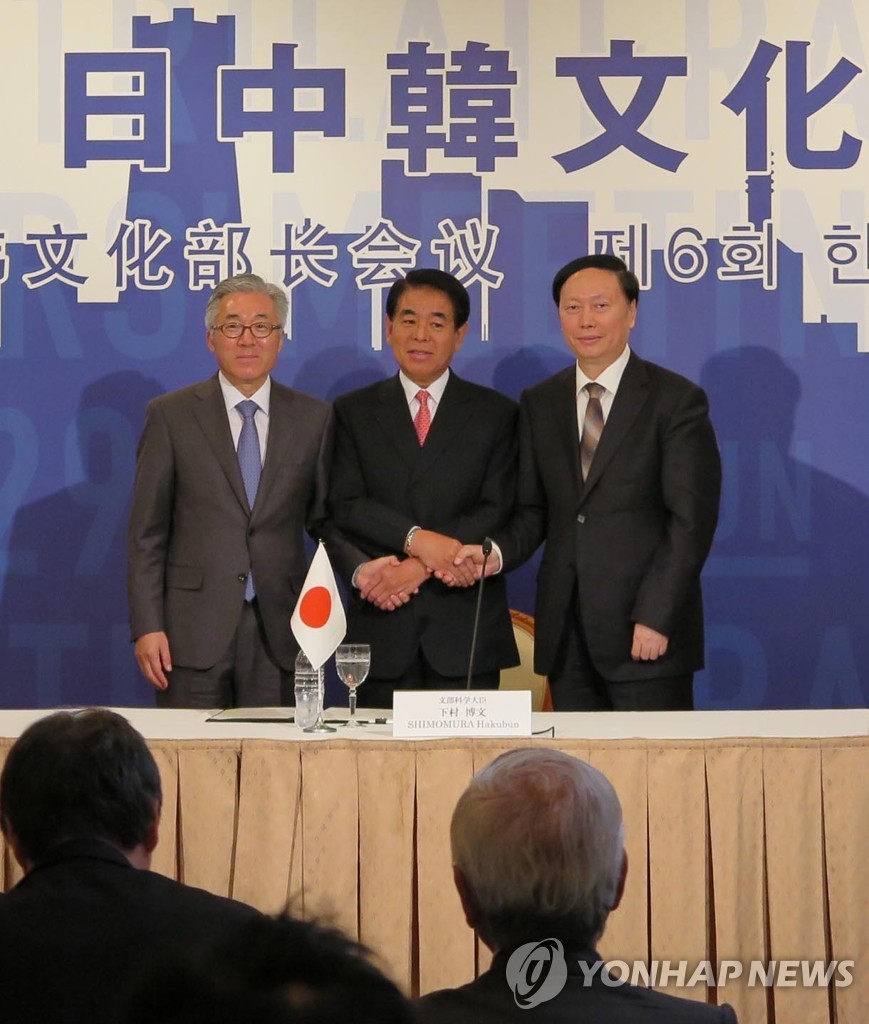 30日,第六屆韓中日文化部長會議在日本橫濱舉行。南韓文化體育觀光部長官金鐘德、日本文部科學省文部大臣下村博文和中國文化部副部長楊志今(從左起)出席了會議。會議通過並簽署了《橫濱聯合聲明》,表明三方將進一步推動彼此之間的文化交流與合作。韓聯社 2014-11-30