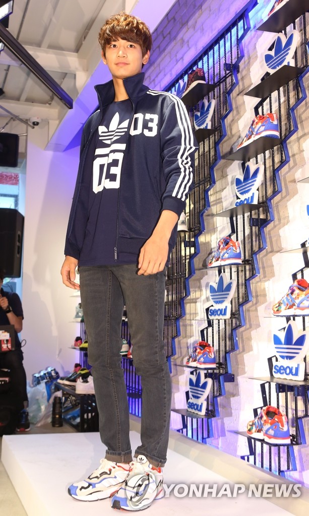 7月31日下午,阿迪達斯運動經典系列旗艦店首爾店開業儀式在位於首爾狎鷗亭的首爾店賣場舉行。當天眾多韓星出席活動共慶開店。圖為SHINee成員珉豪在活動上擺姿勢供拍照。韓聯社 2014-8-1