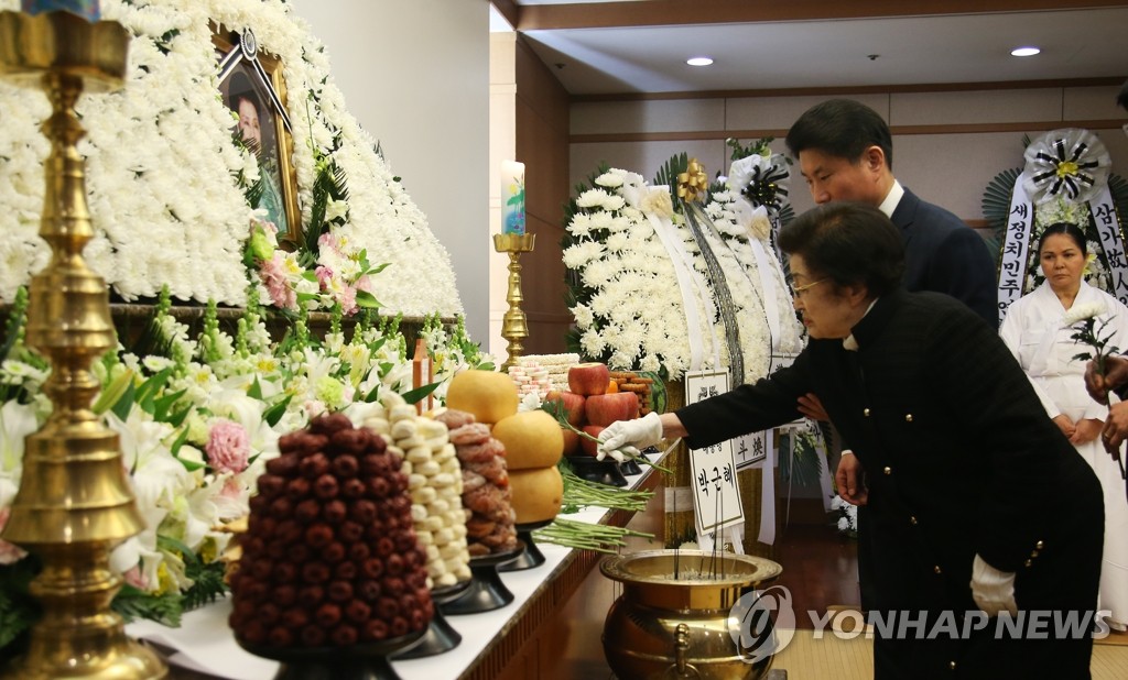 南韓前國務總理金鐘泌的夫人樸榮玉21日因病而逝,享年86歲。樸榮玉是南韓已故前總統樸正熙的兄長樸相熙的長女、樸槿惠的表姐。23日,南韓前總統金大中遺孀李姬鎬前往首爾峨山醫院殯儀館弔唁樸榮玉逝世。韓聯社 2015-2-23