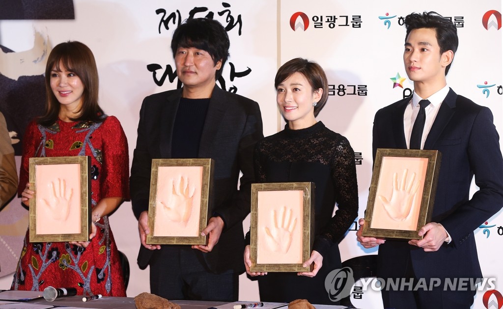 17日下午,“第51屆大鐘獎電影節明星手印製作”活動在首爾中區Avenuel樂天電影院舉行。圖為演員嚴正化、宋康昊、張英南、金秀賢(從左到右)拿著製作好的手印模型接受媒體拍照。第51屆大鐘獎頒獎典禮將於本月21日舉行。韓聯社 2014-11-17