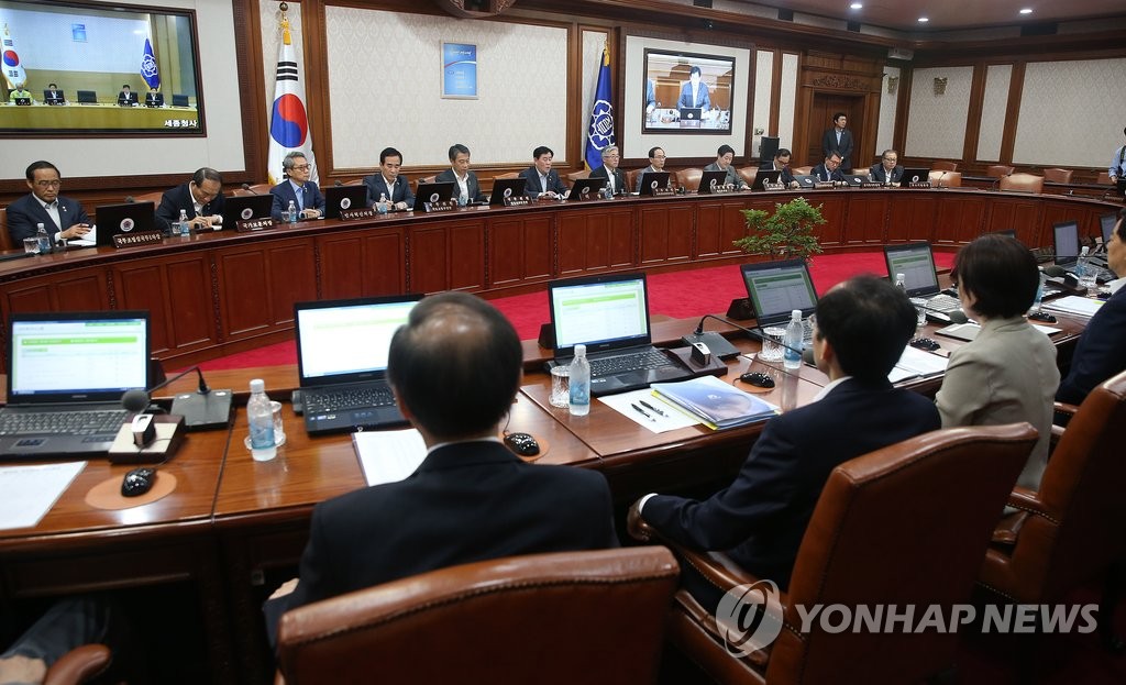16日,在南韓政府首爾辦公大樓,代理國務總理職務的南韓經濟副總理兼企劃財政部長官崔炅煥(左六)主持召開國務會議。他表示,政府將力爭儘早遏制南韓的中東呼吸綜合徵(MERS)疫情。韓聯社 2015-6-16