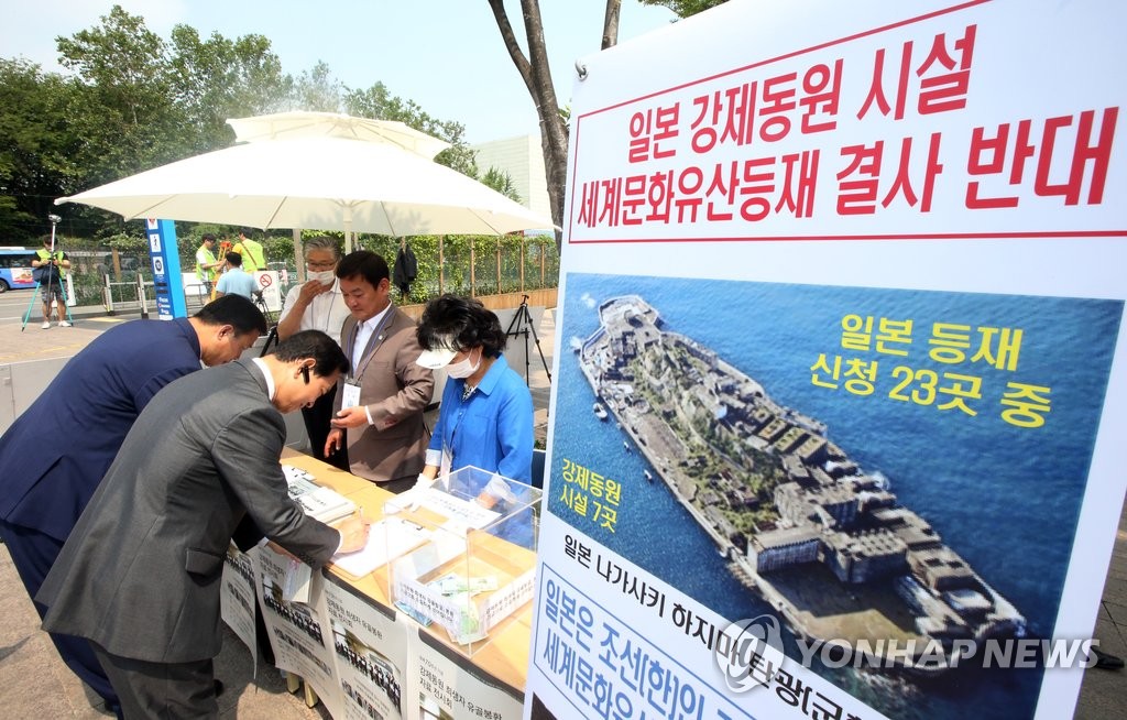 17日,在首爾廣場,市民簽名反對日本將涉及強徵朝鮮(處於日本殖民統治下的半島)勞工的“明治工業革命遺址”申請列入世界遺產名錄。當天,南韓社團法人“亞太和平交流協會”在首爾廣場舉行資料展示會,敦促日方移交強徵勞工犧牲者遺骸,開展反對明治申遺的簽名運動。韓聯社 2015-6-17