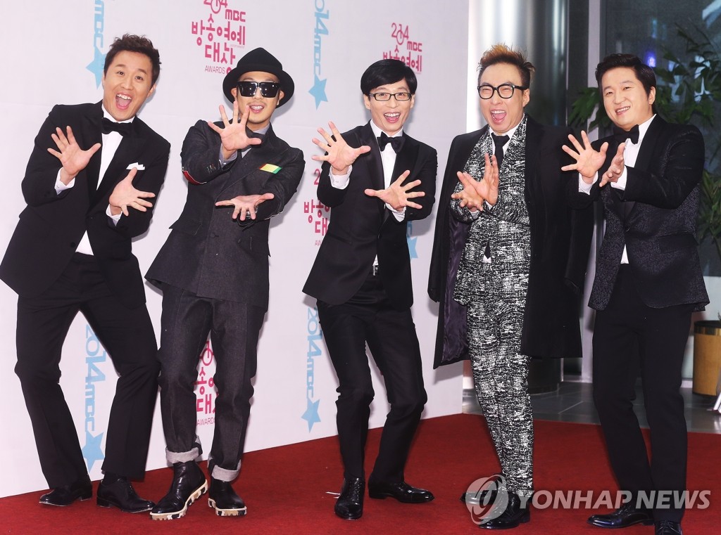 29日下午,《MBC演藝大賞》在首爾上岩洞MBC媒體中心舉行,南韓大熱綜藝節目《無限挑戰》主持成員鄭俊河、HAHA、劉在石、樸明秀和鄭亨敦(從左起)出席了活動。韓聯社 2014-12-29