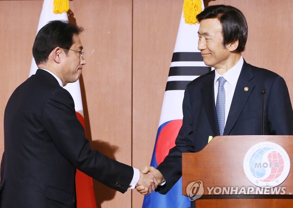 28日下午,在首爾外交部辦公大樓,南韓外交部長官尹炳世(右)和日本外相岸田文雄在會談結束後親切握手。當天,雙方進行“慰安婦問題談判”,並達成一致意見。會談結束後,尹炳世和岸田文雄共同會見記者。岸田文雄表示,日本政府承認在慰安婦問題上負有責任,日本首相安倍晉三以內閣總理大臣的名義“向慰安婦受害人表示誠摯道歉和反省”。尹炳世介紹,將由韓方發起成立慰安婦受害人援助基金,日方將利用財政預算向該基金提供資金,韓日兩國政府將合作開展恢復慰安婦受害人名譽、撫平受害人內心創傷的各種項目。韓聯社