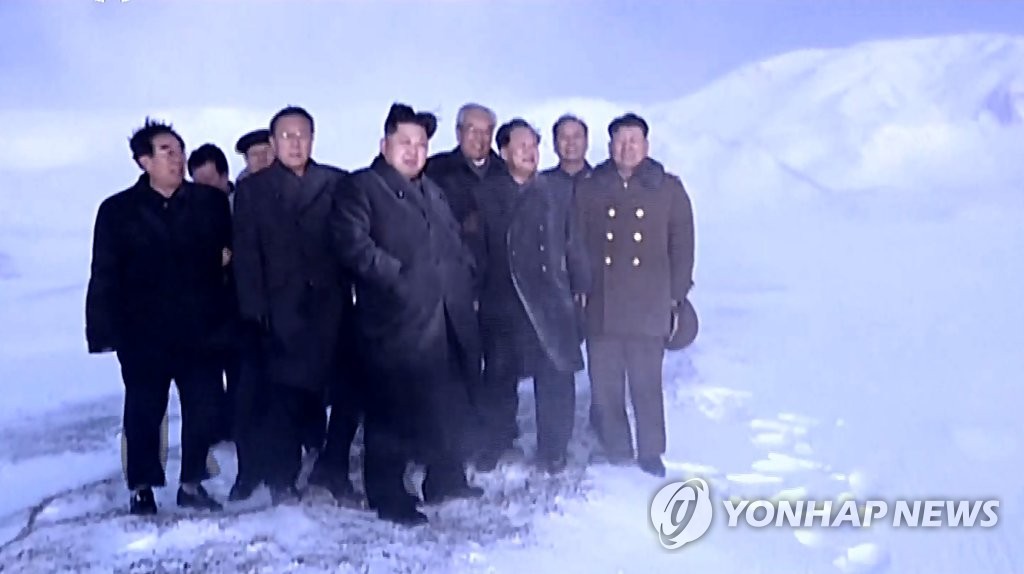 朝鮮國防委第一委員長金正恩和幹部們在白頭山(長白山)以雪山為背景拍攝的視頻被公開。朝鮮中央電視臺11日播放的題為《革命大喜之年——2015年》紀錄片中公開了這個視頻,除了金正恩之外,朝鮮幹部包括崔龍海、金養建、金己男、黃炳誓等人。韓聯社/朝鮮中央電視臺