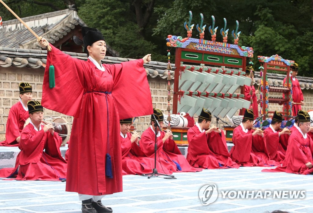 26日上午,“古宮聽古樂”記者會在在位於首爾市中心的宗廟舉行,樂隊在表演“有故事的宗廟祭禮樂”。“古宮聽古樂”活動今年迎來了第七個年頭,9月5日至10月11日分別在宗廟、昌德宮、德壽宮舉行介紹南韓傳統音樂的表演。韓聯社 2015-8-26