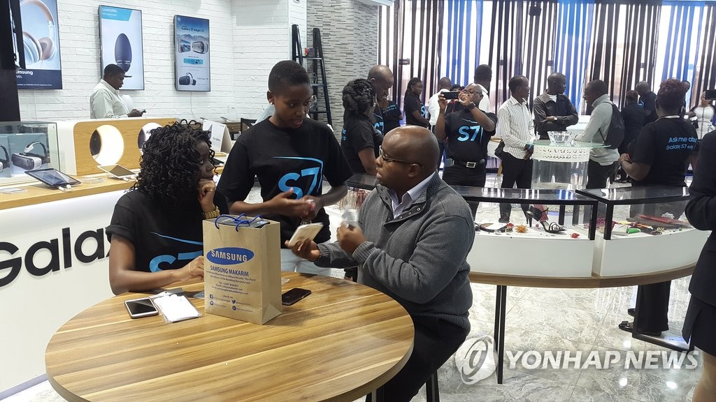 3月18日,在位於肯亞內羅畢的三星電子專賣場,消費者領取事先預定的新款智慧手機Galaxy S7。據三星電子21日消息,Galaxy S7和Galaxy S7 Edge在第二批國家和地區正式開賣,具體包括中國、印度、肯亞、墨西哥等50多個國家和地區,由此Galaxy S7系列銷售範圍覆蓋全球100多個國家和地區。韓聯社/三星電子提供