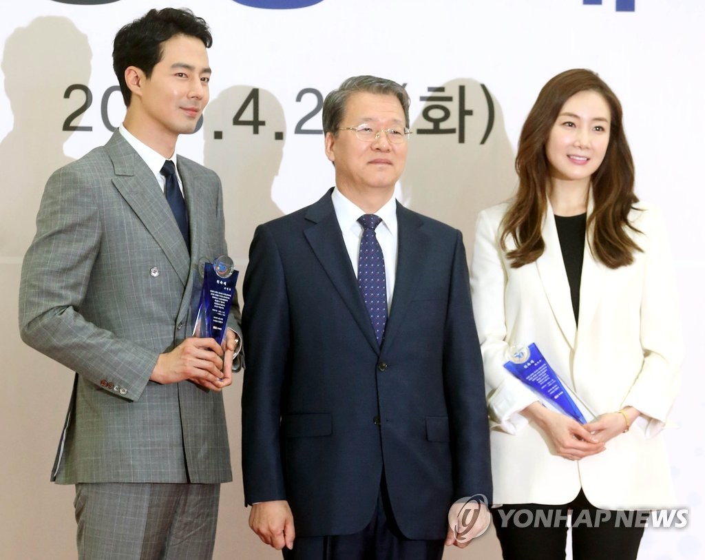 4月26日,在南韓國稅廳,“2016國稅廳形象大使”委任活動隆重舉行。南韓演員崔智友和趙寅成因誠信納稅被聘為形象大使。今後,崔智友和趙寅成將拍攝稅收政策宣傳海報等為營造依法誠信納稅的良好氛圍積極開展宣傳工作。圖為南韓國稅廳廳長林煥守(中)向崔智友和趙寅成頒發形象大使獎盃。韓聯社