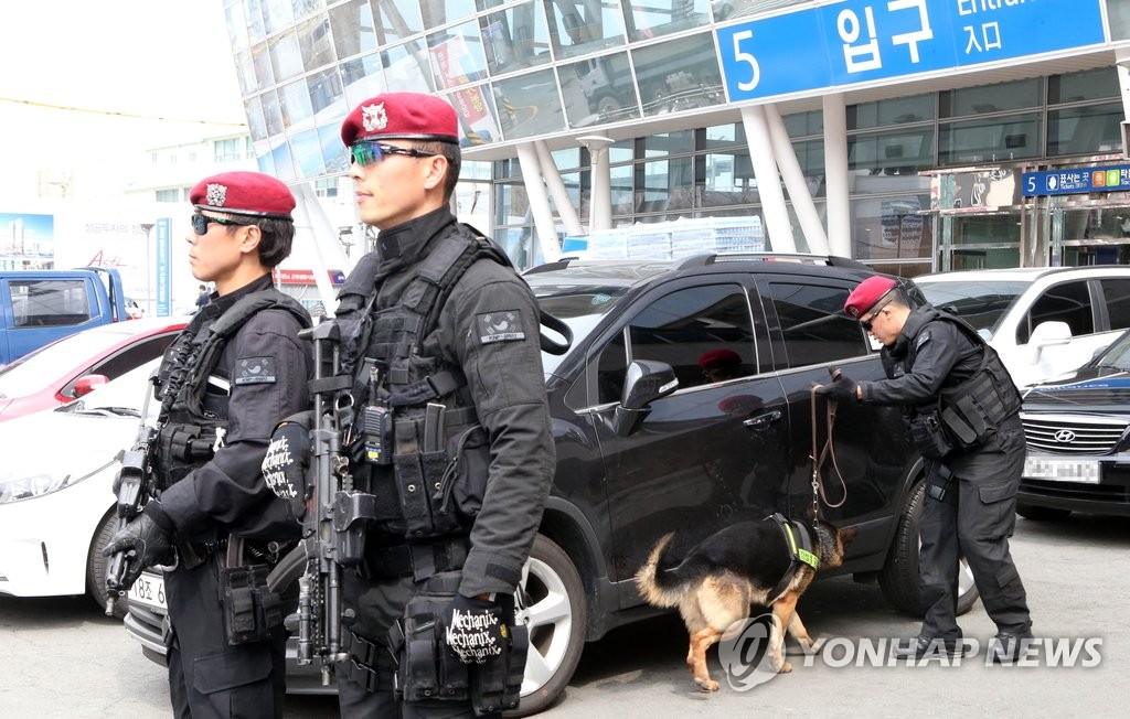 2月19日上午,在首爾金浦國際機場,警察加強安全巡邏以應對可能發生的恐怖事件。據南韓政府消息,朝鮮國防委員會第一委員長金正恩最近下令集中力量準備對南韓進行恐怖襲擊,負責對韓對外特務工作的偵察總局正在做相關準備工作。韓聯社