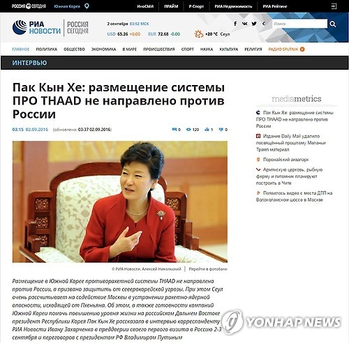 韓聯社首爾9月2日電 南韓總統樸槿惠2日接受俄羅斯官方通訊社“今日俄羅斯”(Rossiya Segodnya)的書面採訪時表示,若朝鮮核與導彈威脅被消除,就不需要在半島部署“薩德”反導系統(末段高空區域防禦系統,THAAD)。