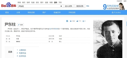 韓聯社首爾10月6日電 南韓網路外交使節團VANK6日表示,近日發現中國最大門戶網站百度的百科有關南韓名人資料中存在不少謬誤,比如南韓民族詩人尹東柱的國籍被記載為“中國”,民族類型被記載為“朝鮮族”。