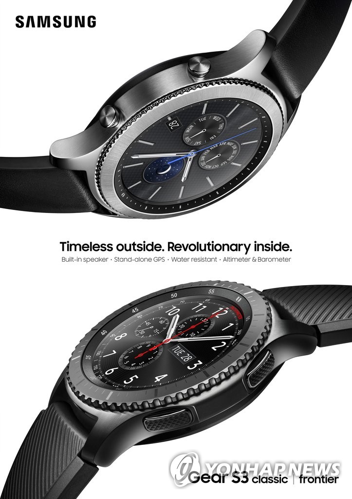 圖為Gear S3 Classic(上)和Frontier款。當地時間8月31日下午,在德國柏林TEMPODROM會場,三星電子舉辦智慧穿戴Galaxy Gear S3手錶的發佈會,全球媒體、合作夥伴、開發商等1500余名人士出席。Gear S3採用泰澤作業系統,具備無線充電和防水防震功能,支援三星自家移動支付服務“三星支付”(Samsung Pay)。韓聯社/三星電子提供