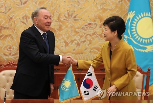 11月10日,在南韓青瓦臺,南韓總統樸槿惠(左)和哈薩克共和國總統努爾蘇丹·阿比舍維奇·納扎爾巴耶夫在歡迎儀式上一同檢閱儀仗隊。納扎爾巴耶夫9-11日訪問南韓,這是他自1995年以來第6次訪韓,也是第6次與樸槿惠會晤。韓聯社