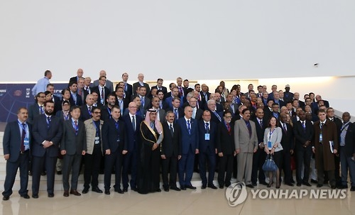 當地時間11月16日,在亞塞拜然首都巴庫舉行的第5屆世界新聞通訊社大會(NAWC)上,韓聯社社長樸魯晃(左一)介紹新聞交流平臺“平昌新聞服務網路(PNN)”。韓聯社