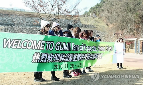 韓聯社龜尾11月28日電 韓星黃致列的200名海外粉絲28日來到黃致列故鄉——慶尚北道龜尾市旅遊。