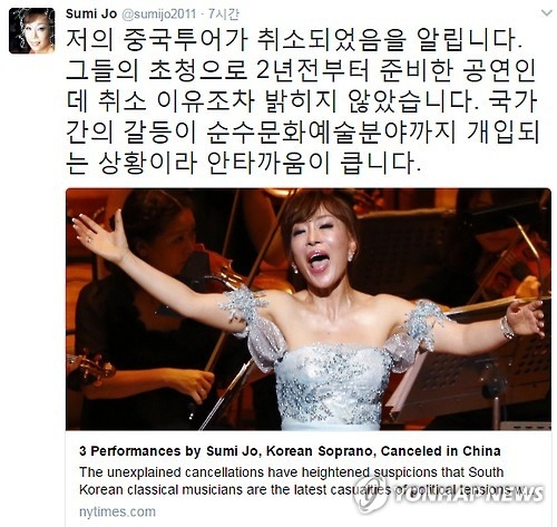 據曹秀美經紀公司介紹,曹秀美原計劃從2月19日起在廣州、北京和上海舉行巡迴演出。22日,廣州、北京、上海交響樂團不約而同地通知演出被取消。此前,中方一直延遲發放她為此申請的簽證。曹秀美24日在自己的推特發文稱,自己應邀從兩年前開始準備此次演出,不知為何演出被取消,她對國家之間矛盾影響到文化藝術感到遺憾。