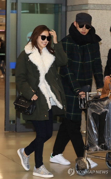 韓聯社首爾1月27日電 22日赴印尼巴厘島度蜜月的金泰希和Rain(鄭智薰)27日結束新婚旅行乘機回韓,于上午10點半左右飛抵仁川機場。