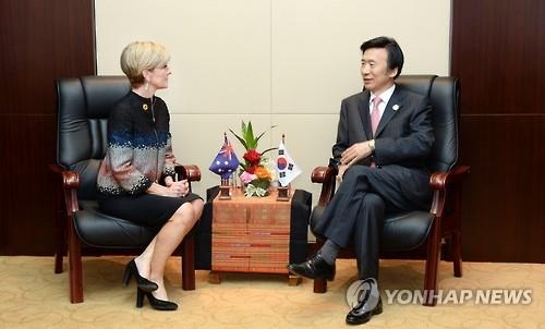 資料圖片:澳大利亞外長畢曉普(左)與韓外長尹炳世(韓聯社)