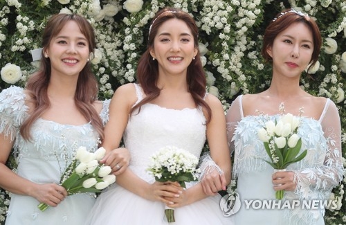 3月23日下午,在位於首爾中區的藥峴聖堂,南韓元祖女團S.E.S的Bada(左二)在此舉辦婚禮。當天,S.E.S另兩位成員柳真(左)和Shoo也齊出動為其慶祝。韓聯社