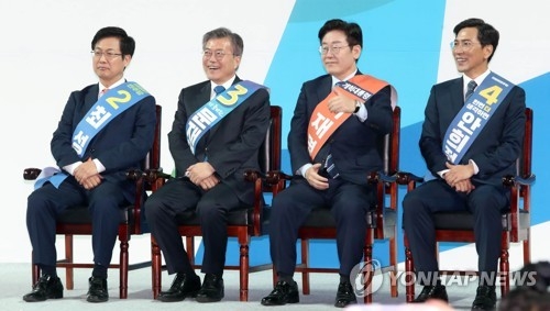 3月21日下午,在首爾市上岩洞MBC電視臺演播大廳,城南市長李在明(左起)、共同民主黨前黨首文在寅、忠清南道知事安熙正、高陽市長崔星等民主黨4名總統選舉有力參選人在錄製時事節目《100分討論》前合影。韓聯社