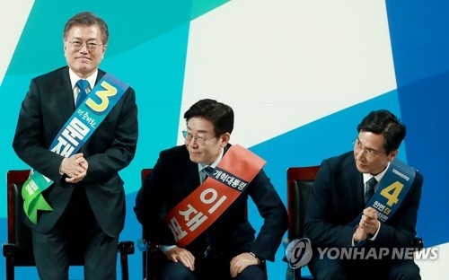 3月21日下午,在首爾市上岩洞MBC電視臺演播大廳,城南市長李在明(左起)、共同民主黨前黨首文在寅、忠清南道知事安熙正、高陽市長崔星等民主黨4名總統選舉有力參選人在錄製時事節目《100分討論》前合影。韓聯社