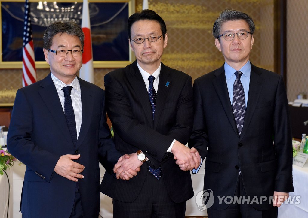 4月25日,在日本東京,韓方團長、外交部韓半島和平交涉本部長金烘均(右起),日方團長、日本外務省亞洲大洋洲局長金杉憲治,以及美方團長、美國國務院對朝政策特別代表約瑟夫·尹在會談開始前握手合影。(韓聯社/法新社)