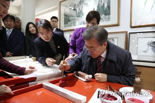 韓聯社北京12月15日電 正在對中國進行國事訪問的南韓總統文在寅和夫人金正淑女士15日到北京琉璃廠文化街和前門大街參觀,體驗中國傳統文化。
