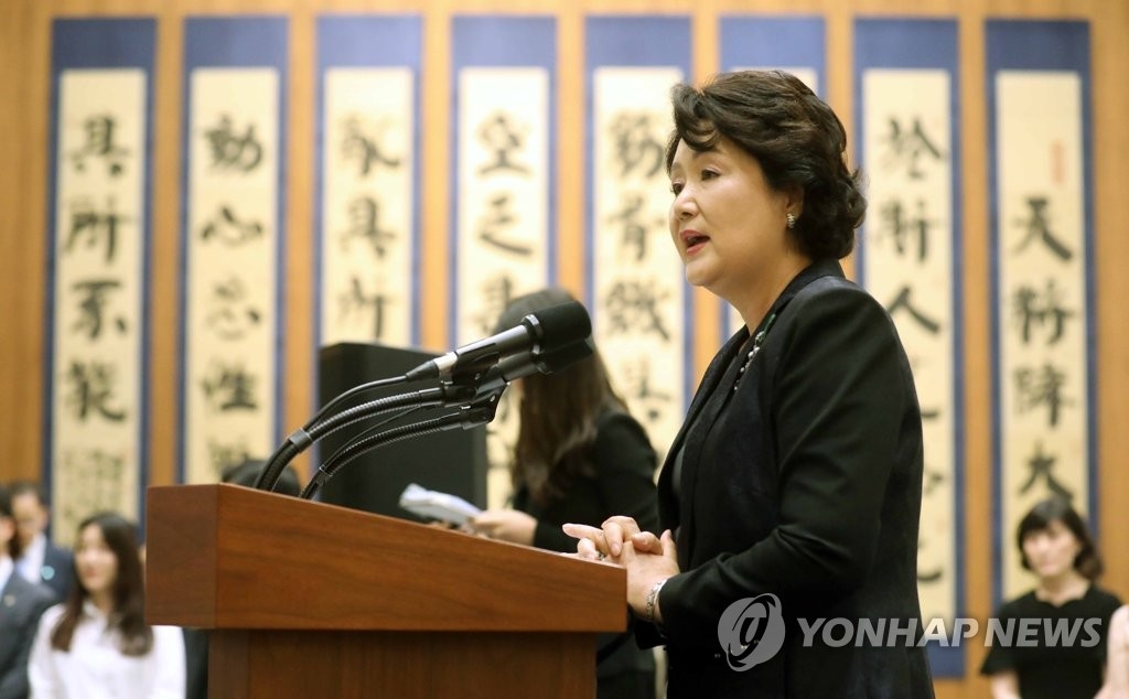 韓聯社首爾6月5日電 南韓總統文在寅夫人金正淑女士5日在首爾藝術殿堂書法博物館出席中國著名藝術家韓美林全球巡展的第五站“美林的世界在首爾”展開幕式。