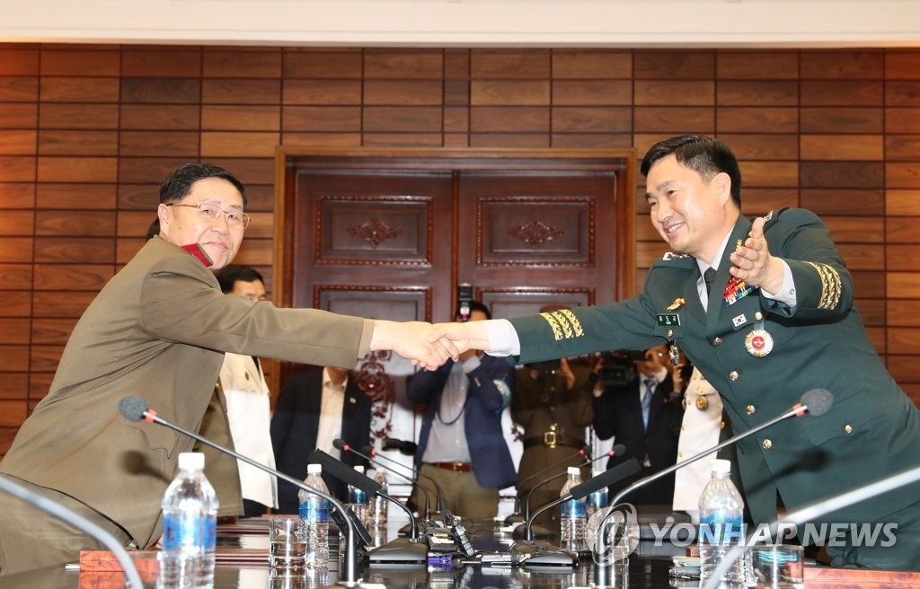 6月14日,在韓朝邊境板門店朝方一側的統一閣舉行的韓朝軍事會談上,韓朝軍事會談韓方代表團團長、國防部對朝政策官金度均(右)同朝方代表團團長、陸軍中將安益山握手。這是韓朝將軍級軍事會談自2007年12月後時隔10年6個月再次舉行。韓聯社/聯合採訪團