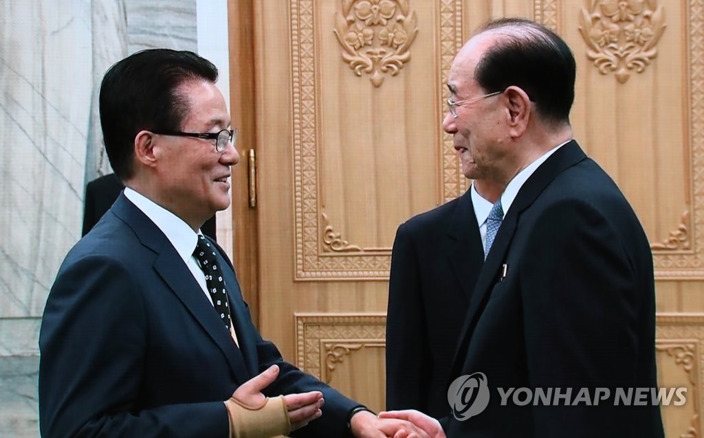 資料圖片:9月18日,在平壤人民文化宮,南韓民主和平黨議員樸智元(左)同朝鮮最高人民會議常任委員會委員長金永南握手。圖為朝朝首腦會談主新聞中心報道畫面。(韓聯社)