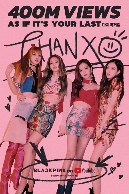 韓聯社首爾9月21日電 人氣女團BLACKPINK去年6月發售的熱歌《像最後一樣》(As If it's your last)MV在視頻網站優兔(YouTube)上播放量于21日中午12時許突破4億大關。
