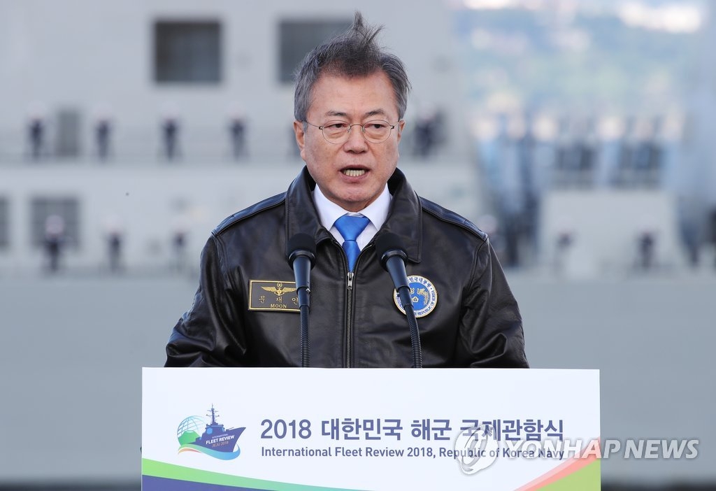 韓聯社首爾10月11日電 南韓總統文在寅11日下午在濟州出席“2018南韓海軍國際閱艦式”併發表講話。文在寅表示,將把濟州海軍基地建成軍民共生的和平之地,也會盡全力療愈在此修建基地給當地居民帶來的巨大傷痛。