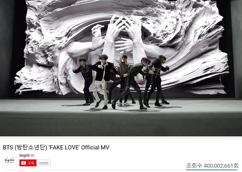 韓聯社首爾12月16日電 據經紀公司Bit Hit娛樂16日消息,旗下當紅男團防彈少年團(BTS)於今年5月發表的熱歌《FAKE LOVE》MV在視頻網站優兔上的播放量15日突破4億次大關。