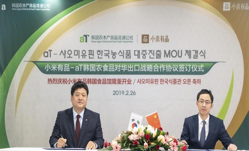 韓聯社首爾3月6日電 南韓農水產食品流通公社(aT)6日表示,該公司中國區本部長鄭然洙(音)日前在北京與小米精品生活購物平臺--小米有品簽署了關於促進南韓農副產品進入中國的諒解備忘錄。
