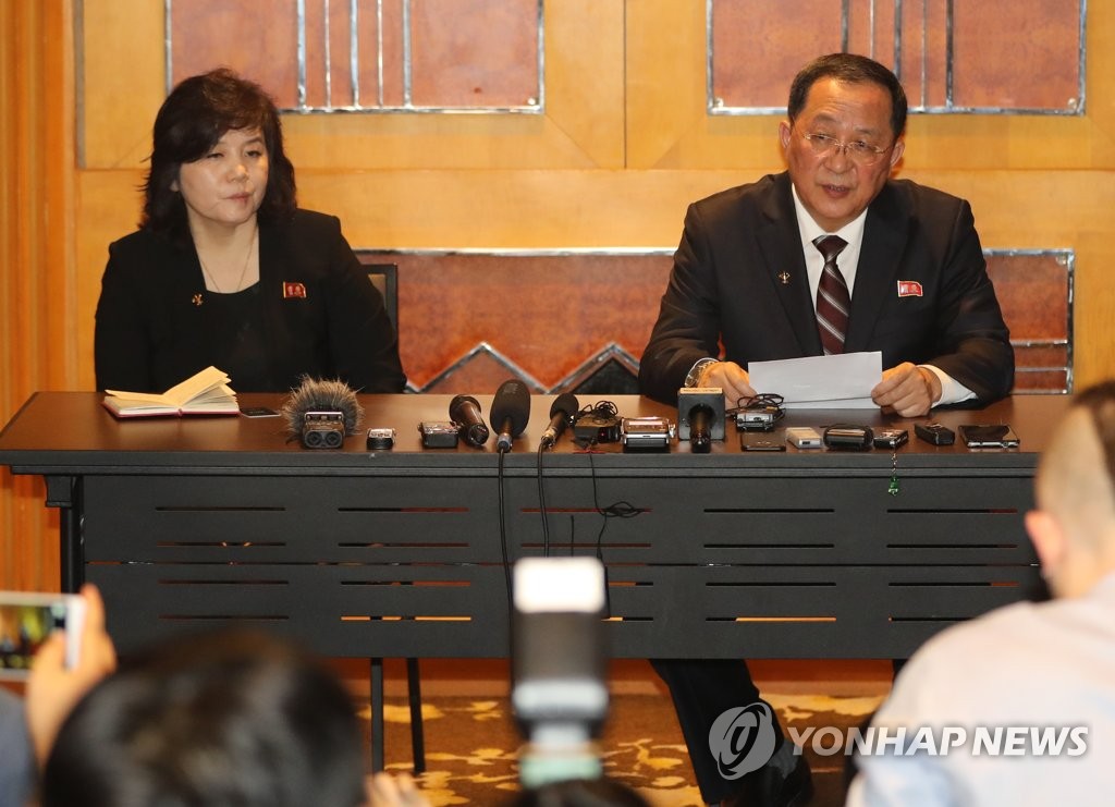 資料圖片:當地時間3月1日淩晨,在河內,李容浩(右)和崔善姬召開記者會就金特會無果而終表態。(韓聯社)