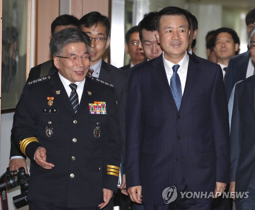 5月27日,在首爾南韓警察廳大樓,警察廳廳長閔鉀龍(左)與訪韓的中國公安部常務副部長王小洪走向會議室。(韓聯社)