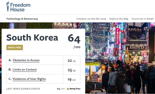 具體來看,南韓在100分滿分中獲得64分,與尼日利亞、安哥拉、突尼西亞、巴西並列第19位,屬於網路部分自由(Partly Free)國家。