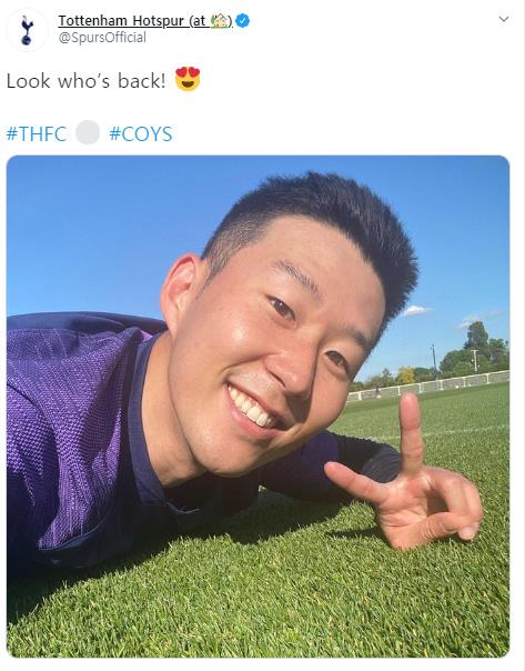 托特納姆熱刺足球俱樂部20日在官方社交網站上傳了孫興慜的照片,並配文“看看誰回來了!”(Look who's back!)。照片中,孫興慜俯臥在球場上面帶笑容,衝著鏡頭比了一個“V”字。