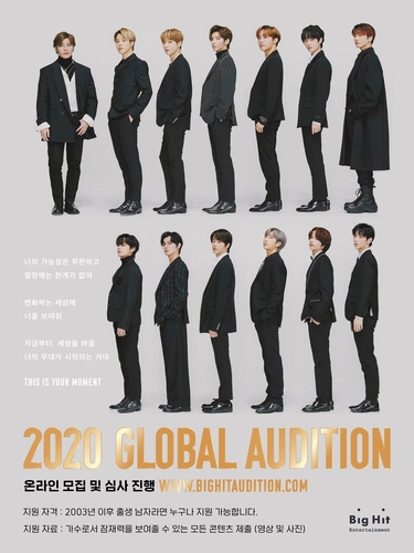 韓聯社首爾6月2日電 經紀公司Big Hit娛樂2日表示,公司1日在官方社交網站發佈“2020 Big Hit全球海選”通知並已開始接受報名。