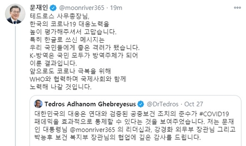 韓聯社首爾10月29日電 南韓總統文在寅29日發推文對世界衛生組織(WHO)總幹事譚德塞讚賞南韓高效抗擊疫情表示感謝。文在寅表示,“K防疫”(韓式防疫)是全體國民作為防疫工作主體付出努力的結果。