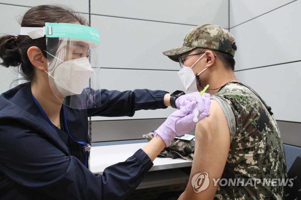 資料圖片:6月7日,在設于國軍首都醫院的新冠接種點,一名士兵接種輝瑞疫苗。 韓聯社/《國防日報》供圖(圖片嚴禁轉載複製)