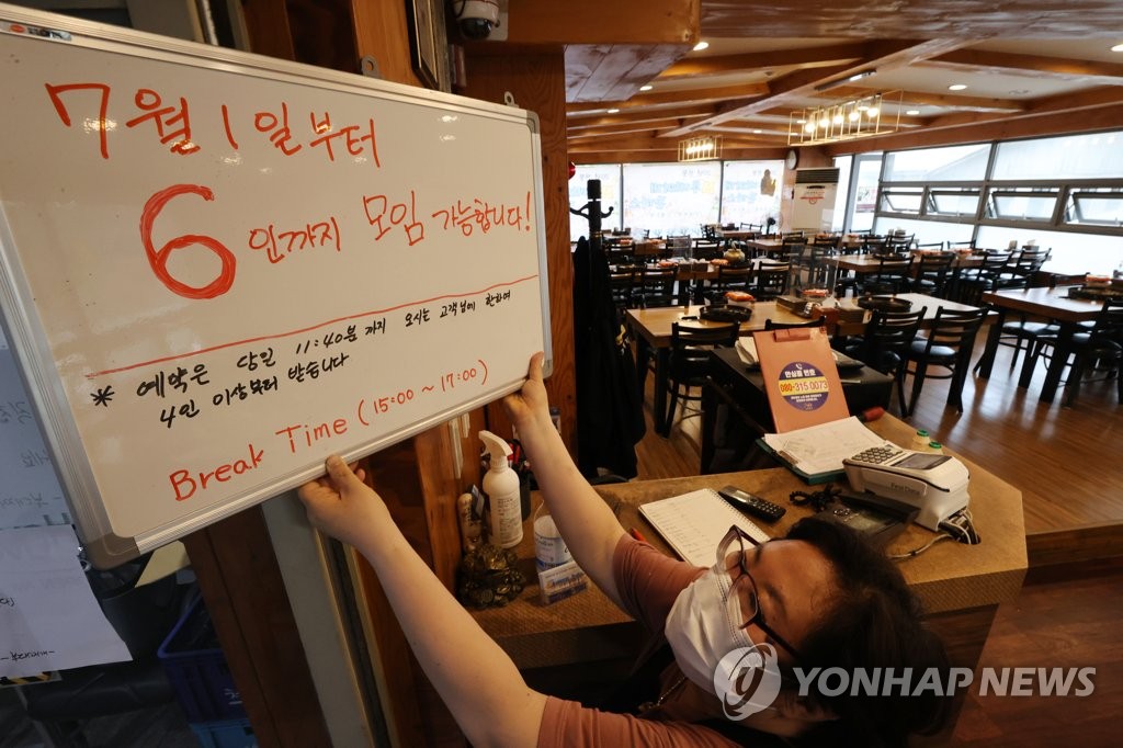 資料圖片:6月28日,在首爾市的一家餐廳,工作人員正懸挂“從7月1日起允許6人聚集”的告示牌。南韓7月起啟用新防疫響應體系,首都圈將實施二級防疫響應,7月1日至14日期間私人聚會限員6人,之後將放寬至8人。 韓聯社