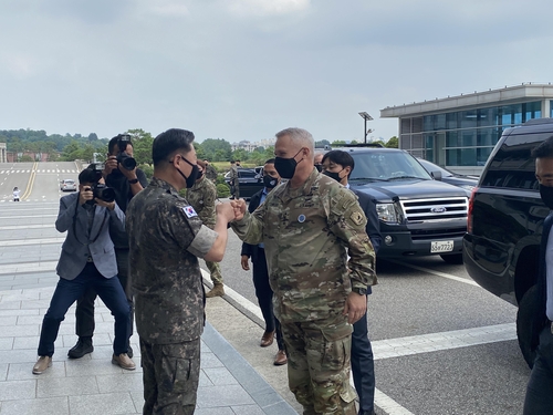 7月13日,在聯合參謀本部大樓,南韓聯合參謀本部議長元仁哲(左)與韓美聯合司令部新任司令保羅·拉卡梅拉擊拳致意。 韓聯社