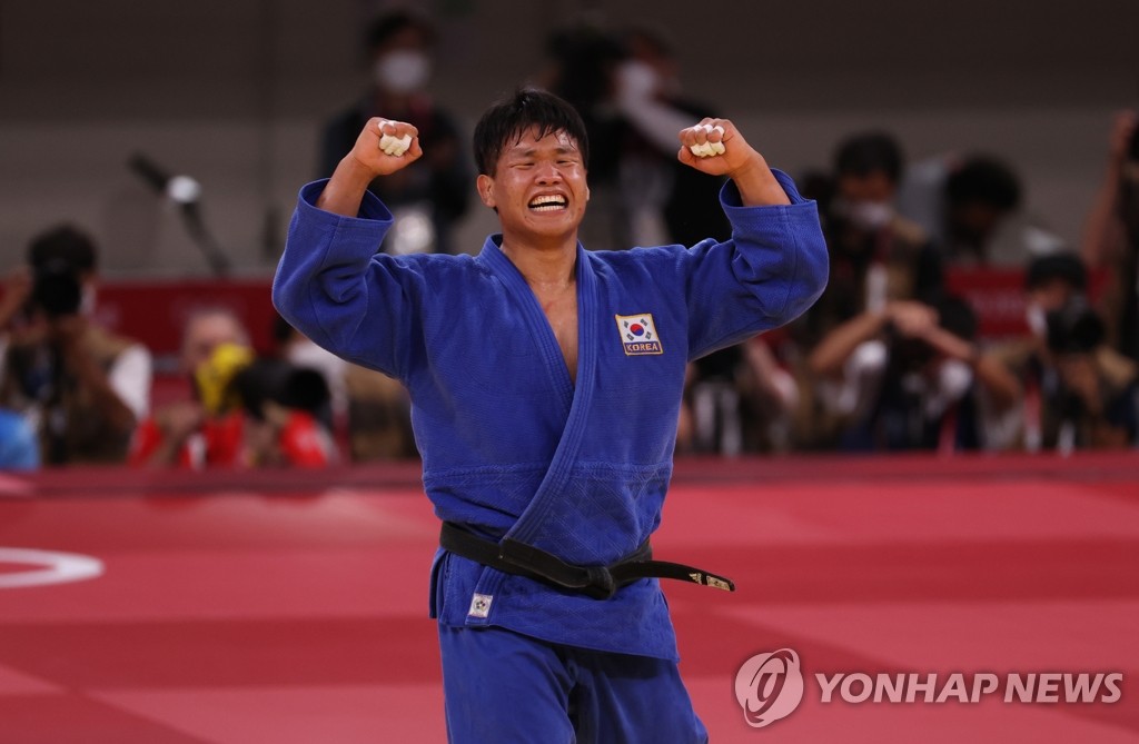 7月29日,在日本武道館舉行的東京奧運會男子100公斤級柔道準決賽中,南韓選手趙求含(音)戰勝世界排名第二的葡萄牙選手約格·豐塞卡,晉級決賽。 韓聯社